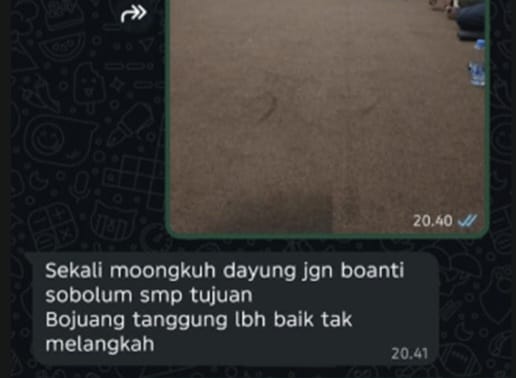 Peserta itu juga meneruskan pesan kedalam WaG itu diduga bahasa ancaman. “Selagi satu kato (kata), kalau tak undur², kami yang mundur. Dari acik awi , posan (pesan) acik awi, sampaikan, cakap dengan roi”. Bunyi pesan yang iya teruskan kedalam WaG tersebut diwaktu bersamaan.