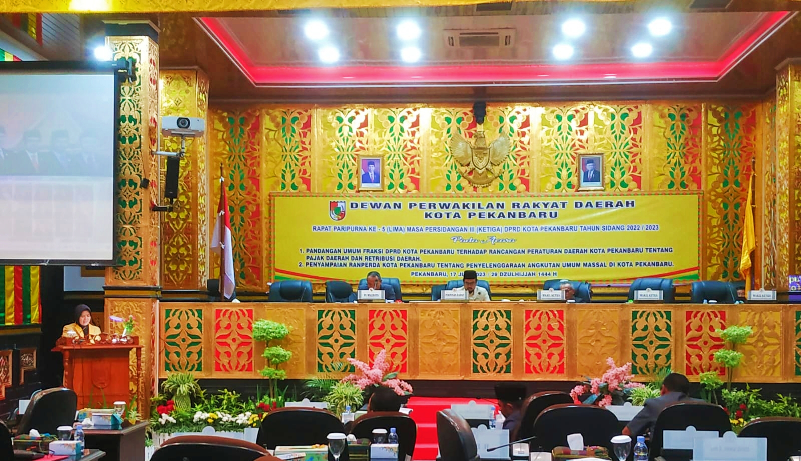 Wartautama.co (Pekanbaru) – Ginda Burnama Wakil Ketua DPRD Pekanbaru dari Fraksi Gerindra pimpin Rapat Paripurna ke– 5 masa Sidang III di Gedung DPRD Kota Pekanbaru pada Senin (17/7/23), untuk membahas dua agenda sidang yaitu pertama Pandangan Umum Fraksi DPRD Kota Pekanbaru Terhadap Rancangan Peraturan Daerah Kota Pekanbaru Tentang Pajak Daerah Dan Retribusi Daerah, Kedua Penyampaian Ranperda Kota Pekanbaru Tentang Penyelenggaraan Angkutan Umum Massal di Kota Pekanbaru, bertempat di Gedung DPRD Kota Pekanbaru Jalan Sudirman.